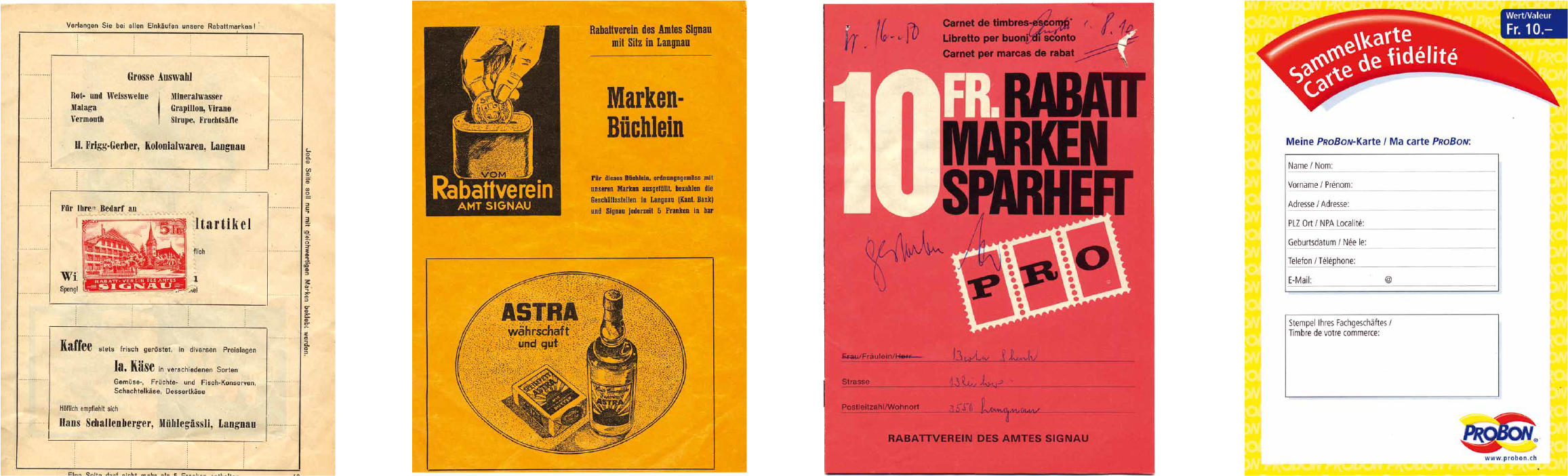 Der heutige «Verein Probon Emmental und Entlebuch» wurde 1909 als «Spar- und Rabattgenossenschaft Langnau und Umgebung» gegründet, 1923 kam die Umbenennung in «Rabattverein Amt Signau». Zwar waren dem Verein rasch einmal um die 70 bis 80 Geschäfte beigetreten, doch der Erste Weltkrieg und später die Wirtschaftskrise der dreissiger Jahre liessen den Umsatz mit Rabattmarken darben. Prägende Person im Verein war Friedrich Stettler von der Schuhhandlung an der Oberstrasse: von 1917 bis 1920 war er Präsident, danach während 26 Jahren Geschäftsführer und verantwortlich für die Markenausgabestelle. Nach dem Zweiten Weltkrieg der «Boom»: bereits 1952 zählte der Verein über 100 Mitgliedgeschäfte, die Rabattmarken abgaben.